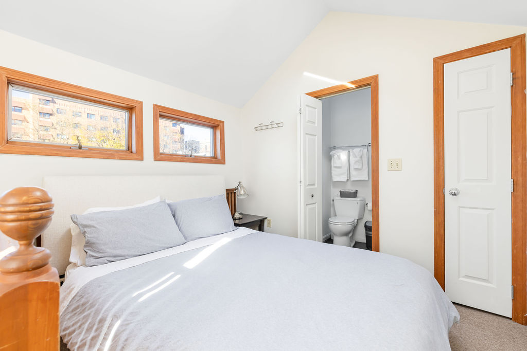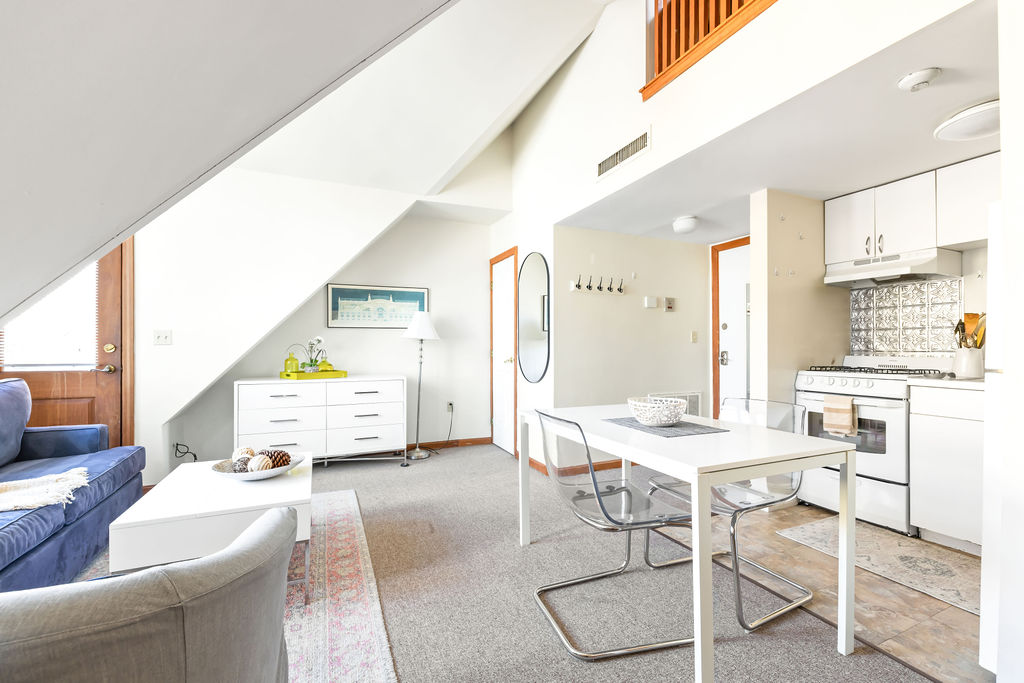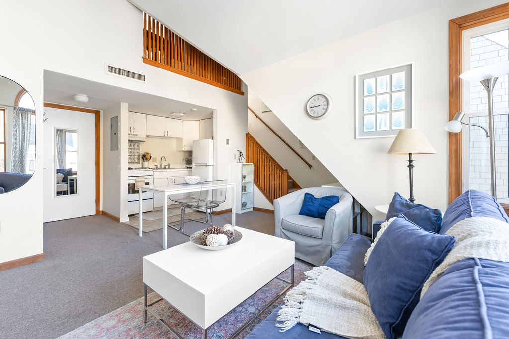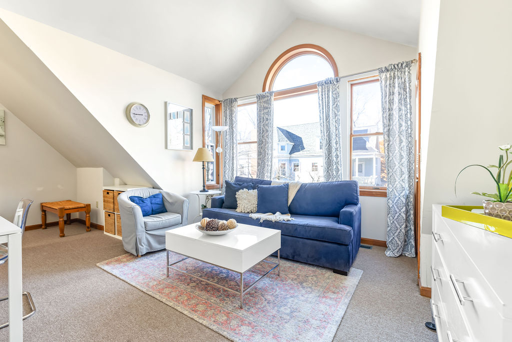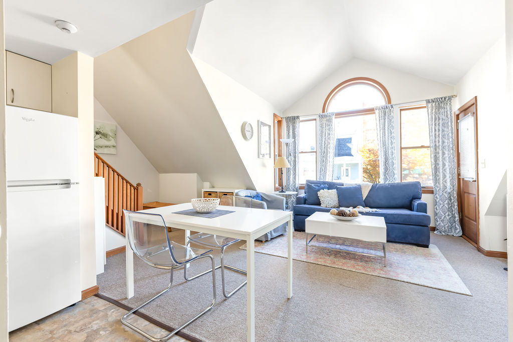 An upper-level unit within the carriage house, featuring comfortable living areas and strong natural light.