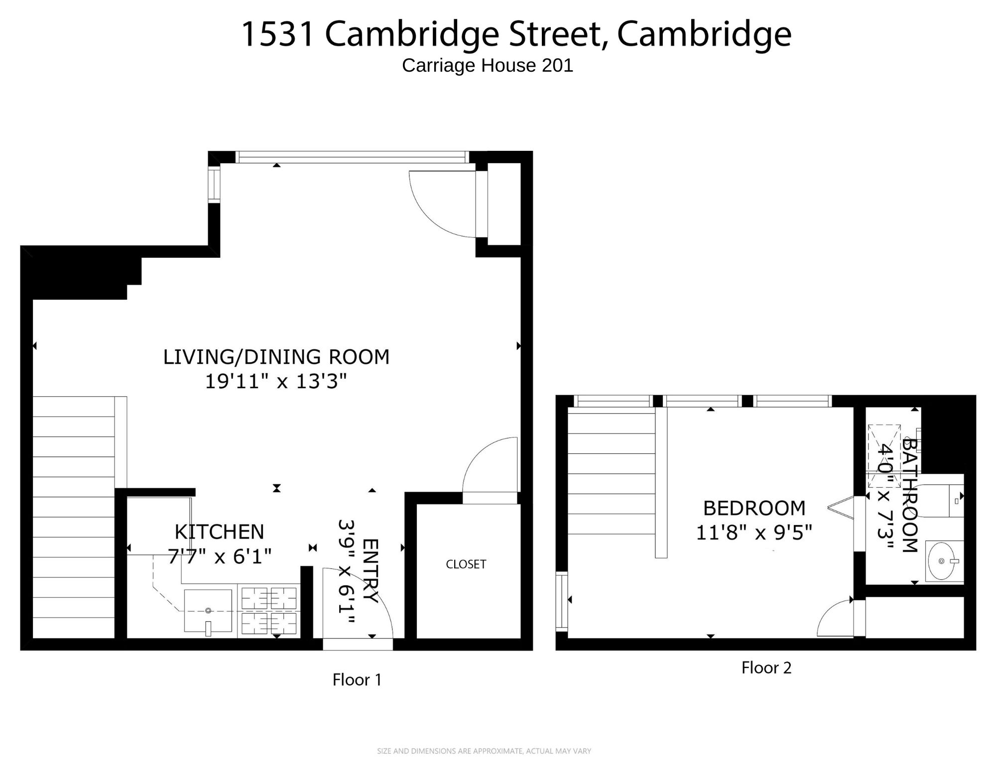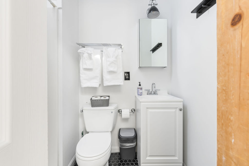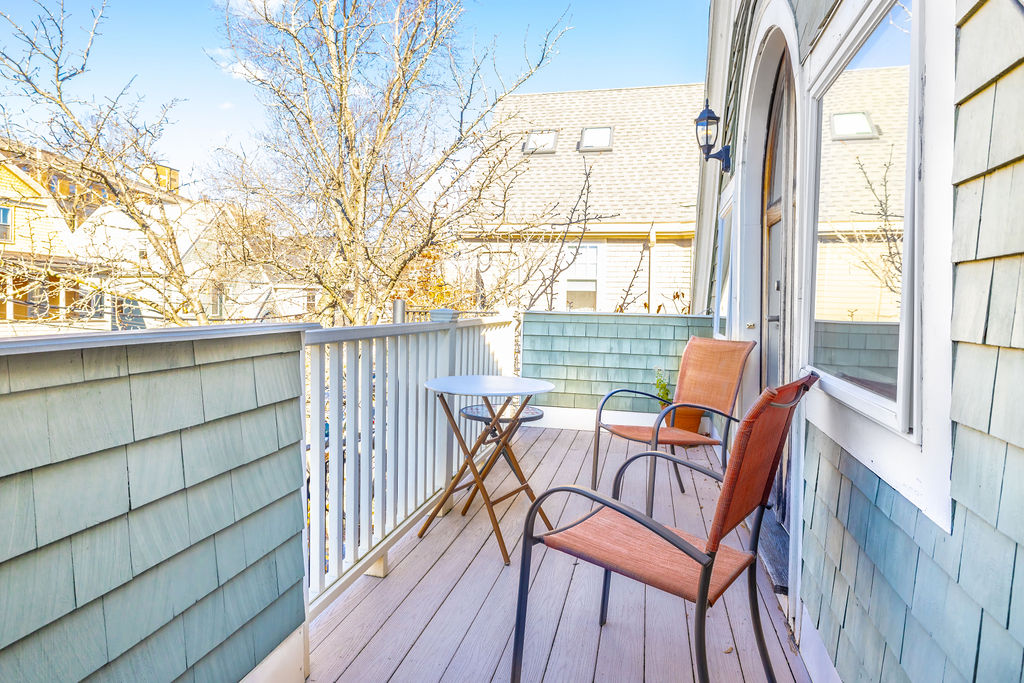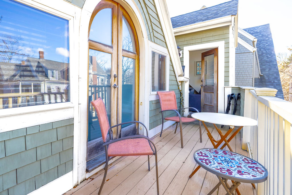 An upper-level unit within the carriage house, featuring comfortable living areas and strong natural light.
